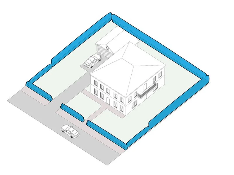 An area designed to separate properties with different purposes. For example, hedge rows or walls separating residential and commercial uses.
