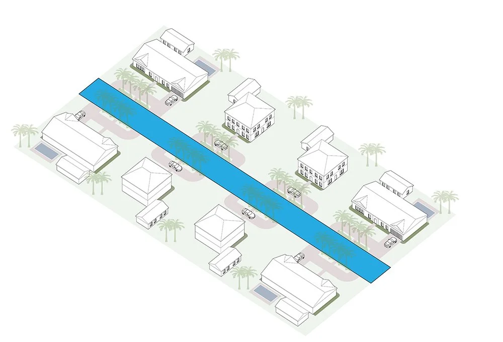 The strip of land that is used for a street or utility lines. In an urban environment, the right of way is typically owned by the municipality and includes sidewalks, planting strip buffers, curbs, streets, and medians. Alleys are also often part of the public right of way.